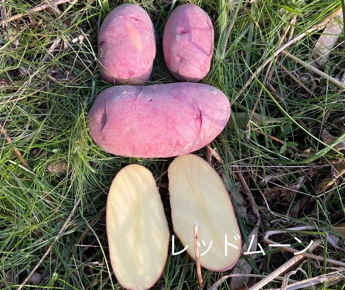赤の紫の2色をしている珍しいジャガイモです。覆面レスラーのような見た目から別名「デストロイヤー」と言われる場合もあり、レッドムーンの変異株を固定したものです。
